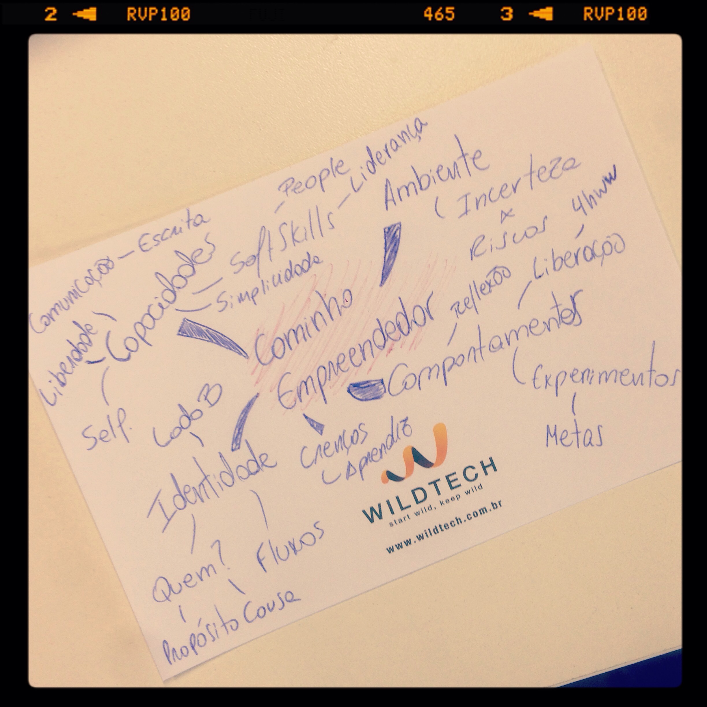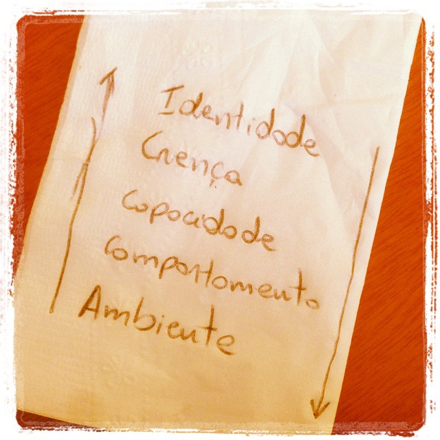 Eu acabei montando a palestra usando uma estratégia de Níveis Neurológicos, pensando em ambiente, comportamento, capacidades, crenças e chegando a tal identidade. Para guiar o meu processo de criação, usei um mapa mental para pensar a respeito da palestra.