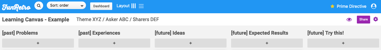 What next? You can run this activity using physical table / board / wall and some notes and you can use digital tools like spreadsheets, text documents with tables, trello, miro, mural or funretro. I’m adding an example that I’m using with funretro.
