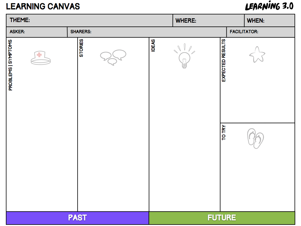 That’s how a Learning Canvas can help people in this approach. We can engage people into different steps of the same conversation. We can set a theme and find people to share about the theme and learn from their experience.