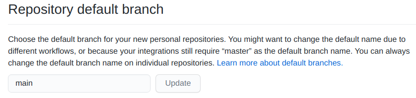 Aí para quem usa o github, fica esta dica, para trocar o branch padrão para o nome que você preferir, indo na url github.com/settings/repositories.